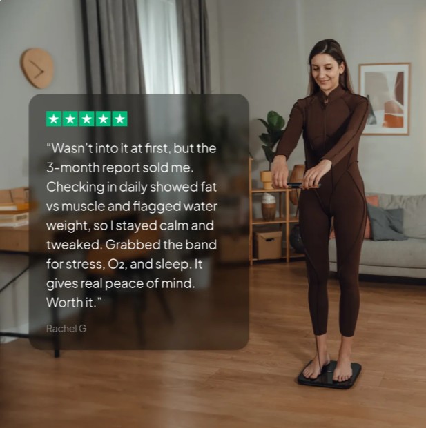 „Früher war ich entmutigt, wenn mein Gewicht trotz regelmäßigen Trainings schwankte. Dieses Gerät hat mir geholfen zu verstehen, was in meinem Körper wirklich vorgeht. Nach ein paar Tagen Eingewöhnungszeit möchte ich es nicht mehr missen.“Marcus